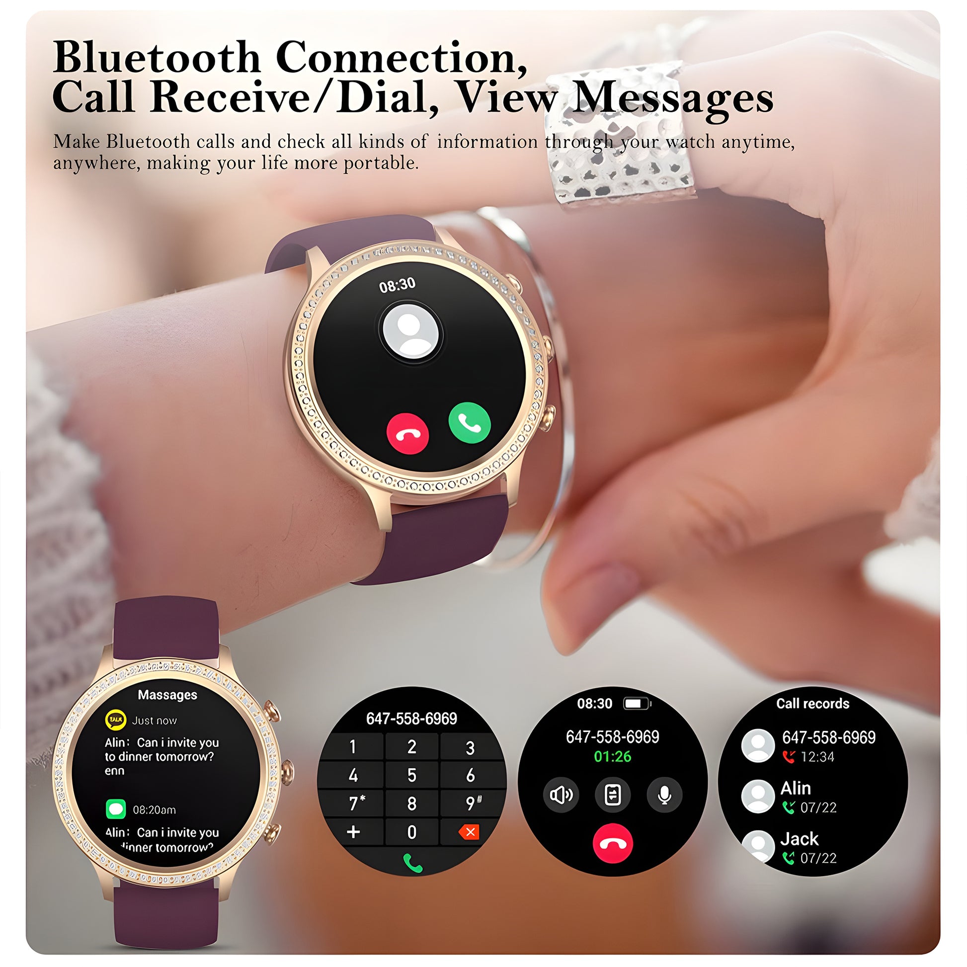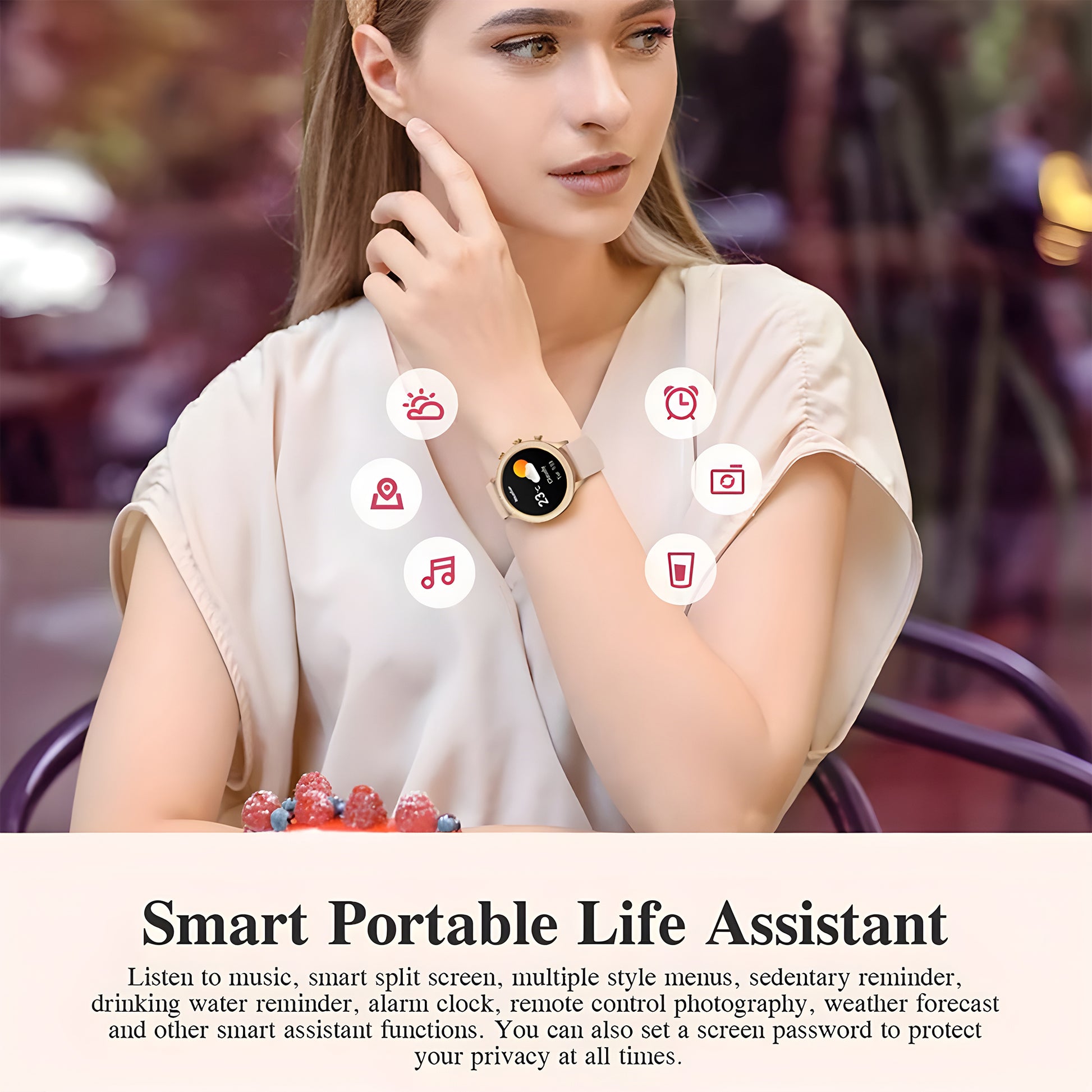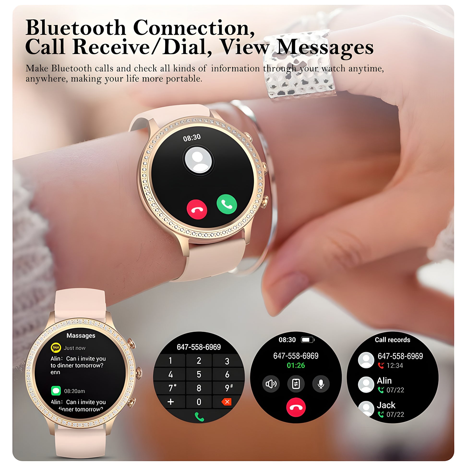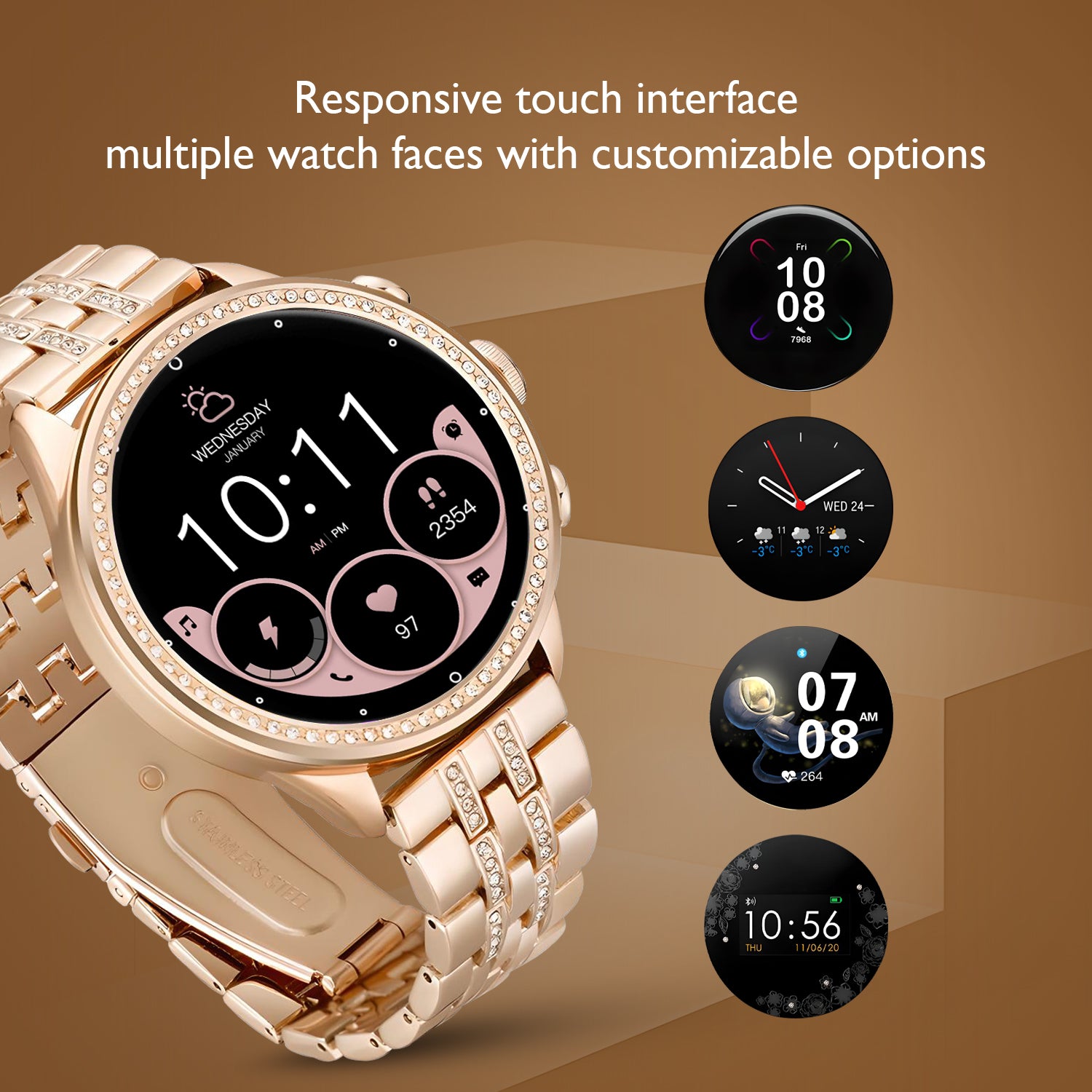 Introduce our new (Upgrated Version) of PF9 Series, Specially for women and girls this smartwatch is comes with very elegent design, and smart featurs, elevate your lifestyle with this PF9 Series smartwatch, with premium and luxury design, a stunning AMOLED Display, Fitness tracking, track your fitness goal, 25+ Sports mode, Health monitoring featurs, monitor your heartrate accuratly and SpO2 level, listing music and make a call / received call by with bluetooth connectivity, save upto 30+ contact in this smartwatch, change the smartwatch faces according to match your style and mood through the Lefun Health aap